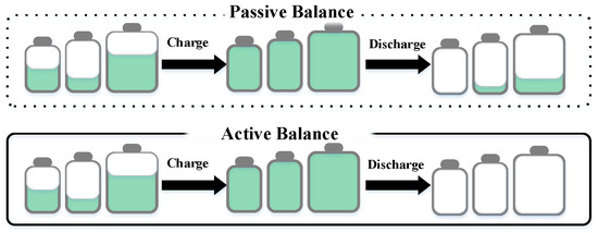 BMSs are very important for the suitable operation of any battery pack. They are in charge of ensuring the battery operation into the safe operating area, monitoring the state of the battery pack, and recording useful data [4,5]. Among the different tasks of the BMS [6,7], one of the most important tasks is to estimate and balance the state of charge (SOC) of the battery cells. The estimation is very important since battery cells can be damaged in case of both overcharge and overdischarge events. On the other hand, the balancing allows using the whole stored energy by avoiding stopping the pack when only one of the cells reaches the minimum SOC. These differences during discharging are due to the different capacities of the cells [8,9]. Indeed, the manufacturing process cannot guarantee the same capacity for all the produced cells. Moreover, the aging process differently affects the cells by resulting in a wide range of the capacity values. For these reasons, balancing methods are adopted. Two main balancing techniques can be distinguished: passive methods and active techniques [10,11]. The first ones dissipate the exceeded energy of unbalanced cells on external resistors in order to balance the cells during charging time. This method is simple to implement; however, the cell’s temperature increases due to high losses, the efficiency is limited, and no balance is achieved during discharging. For these reasons, active balancing techniques have been proposed [12,13]. They are able to balance the SOC by moving the energy among the cells thanks to additional circuits. The benefit is to increase the useful capacity of the battery pack as shown in Figure 1.