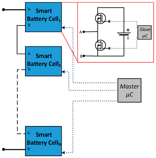 A module-integrated distributed battery energy storage that includes a DC/DC converter in each module has been proposed in Reference [14]. In Reference [15], the active balancing method is instead based on a flyback DC/DC converter topology able to move energy from one single cell to the stack or vice versa. Several examples of solutions that adopt additional energy storage elements can be found in literature [16,17,18]. The authors in Reference [19] proposed an interleaved equalization architecture for series-connected battery strings. However, all these solutions require either additional energy storage elements or DC/DC converters at a cell/module level along with their inherent fast switching. In order to avoid the use of those elements, of particular interest is the cell-module bypass methods. A BMS architecture based on the cell bypass concept has been proposed in Reference [20]. It is able to dynamically insert/bypass a cell in a battery module in order to ensure the balancing among the cells. However, no intelligence is added in the cell by keeping all the computational effort in a main controller and the applications are limited to low-to-medium power, such as electric bicycles. In Reference [21], a dynamically reconfigurable independent cellular switching circuit has been proposed for managing battery modules. It is able to reconfigure the battery module on-line by achieving serial, parallel, and hybrid connection configurations. The authors in Reference [22] proposed a multilayer modular balancing strategy for individual cells. They demonstrate a good balancing of the SOCs, but the cell structure is more complex requiring inductors at a cell level. Dynamically reconfigurable battery systems were also proposed in literature where both the cell level and the module level can be reconfigured in real time according to the load profile [23]. These solutions employ a built-in switching-array circuitry that however increases the complexity of the system.
