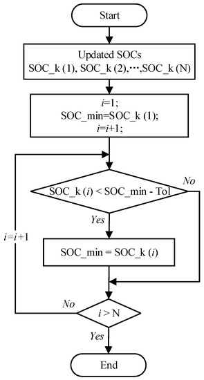 During charging and discharging processes, the SOC of each cell is evaluated by a local microcontroller. Then, all the estimated SOCs are sent to the main control that decides which cells to be inserted in the circuit. During discharging, the cell with the lowest SOC is bypassed; on the other hand, during the charging process, the cell with the highest SOC is removed from the circuit. The bypass decision is made each time when the master controller sends information to the salves. The flowchart of the balancing algorithm is shown in Figure 4, where SOC_k is the state of charge of the cell at the current time k; SOC_min is the minimum SOC among the cells in the battery pack at the time k; N represents the total number of the cells and i identifies the cells; Tol is a tolerance introduced for avoiding switches among cells when the SOCs are very close to each other. After having received the estimated SOCs from each slave, the master finds the cell with the lowest SOC in the battery pack. Then, the command is sent from the master to the slave to bypass or insert the specific cell. The balancing process during discharging is shown in Figure 5.