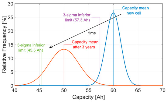 Then, the useful capacity can be evaluated as the 90% of the battery capacity. However, the latter is not fixed, and it depends on different factors (manufacturing, aging, etc.). As described in Reference [28], the capacity value distribution can be seen as a normal distribution with a mean value µ and a standard deviation σ. Considering new battery cells of 60 Ah, the capacity mean value is 60 Ah and the standard deviation is considered equal to 1.5%. After 3 years, the capacity mean value is reduced to 50 Ah and the standard deviation is about 3%, as shown in Reference [28]. Figure 6 shows the trend of the normal distribution of the capacity values. It can be seen that µ decreases with the aging and at the same time σ increases.