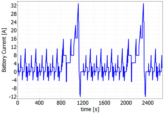 In this section, simulation results are provided in order to demonstrate the superior performance of the proposed SBP in comparison with that of a conventional pack. The latter is usually composed of a series connection of battery cells. The classical BMS adopts a passive balancing technique where the SOC balancing is only ensured during the charging process. Then, a realistic assumption is that the battery cells are balanced at the beginning of the discharging process, i.e., maximum SOC deviation of 1% among the cells. The test is made considering an EV application, and then a real driving profile is considered during the simulations, i.e., the Multi-New European Driving Cycle (NEDC) profile shown in Figure 8. To speed up the simulations, twelve Li-ion cells rated as 3.2 V/60 Ah are considered in the battery pack. Similar results are expected if the proposed SBP is compared with a battery pack with active balancing. However, the proposed solution integrates the BMS functionality in the pack by achieving the monitoring and the balancing through wireless communication.