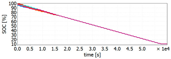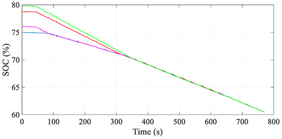 Another experiment was carried out in order to compare the proposed SBP with a classical battery pack in terms of the driving range. Figure 14 shows the SOC of the cells (4 in the considered battery pack) when the initial SOC is equal for all of them and a variation of 5% is considered for the battery capacity.