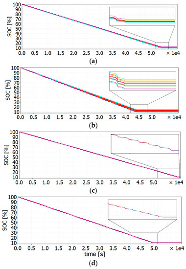 SOC of the cells in the battery pack with insets showing the situations at around 10% of the SOC: (a) passive balancing with cells at the BoL; (b) passive balancing with 3-year-old cells; (c) active balancing with cells at the BoL; (d) active balancing with 3-year-old cells.