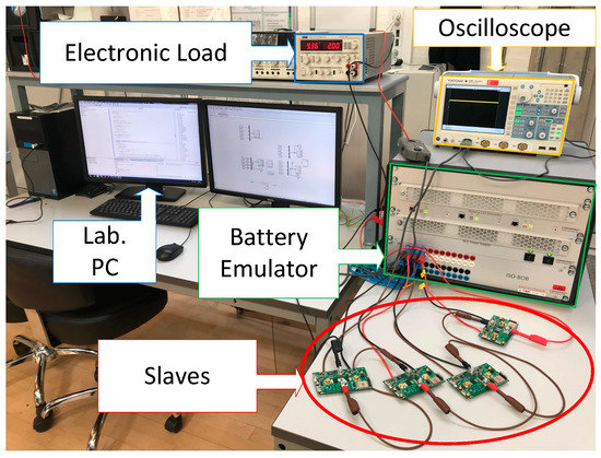 The proposed SBP is intended for EV applications as discussed in the previous section, but not limited to it. However, in order to validate the proposed SBP, a down-scaled experimental prototype has been built. It consists of a COMEMSO battery cell emulator adopted for emulating 4 battery cells. It is controlled by a laboratory computer through CAN communication. A battery model is implemented in Simulink and the CANoe software tool from Vector Informatik Gmbh works as an interface between the Matlab model and the battery emulator. The real current is sensed and sent to the model. It evaluates the SOC and the Open Circuit Voltage (OCV) thanks to a pre-loaded OCV-SOC table. Then, the battery voltage is obtained and sent to the battery emulator that emulates it at the output. In the conventional battery pack, the 4 cells are simply connected in series. On the other hand, in the proposed SBP, the outputs of the battery emulator corresponding to the 4 cells are connected to the slave boards, as shown in Figure 11.