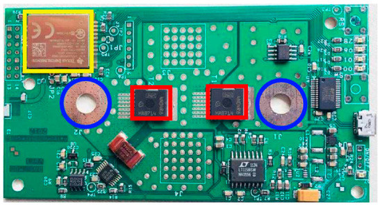 Figure 12 shows the slave board PCB with terminal connection for the battery cell (blue), switches (red), and a CC3200MOD Wi-Fi module from Texas Instruments (yellow). The master is used for implementing the discussed BMS. The master algorithm is implemented on a Snickerdoodle board featuring a Xilinx ZYNQ system on chip and a Texas Instruments WiLink8 RF transceiver module that enables Wi-Fi communication. The WiLink8 transceiver implements the physical layer of the Wi-Fi communication stack and it is interfaced to the ZYNQ through an SDIO interface. A pre-built Linux image running on the ZYNQ manages the upper layers of the Wi-Fi protocol. The Hostapd user space daemon is responsible for implementing the AP functionality and managing the Wi-Fi network created. An electronic load is connected to the output of the battery pack. The battery pack is discharged with a constant current equal to 2 A. The adopted current probe is a 701930 Yokogawa hall effect current probe and the voltage–current ratio is equal to 10 mV/1A.