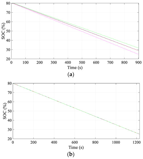 SOCs during discharging: (a) passive balancing; (b) proposed SBP with active balancing. Each line corresponds to the SOC of one of the cells in the considered battery pack.