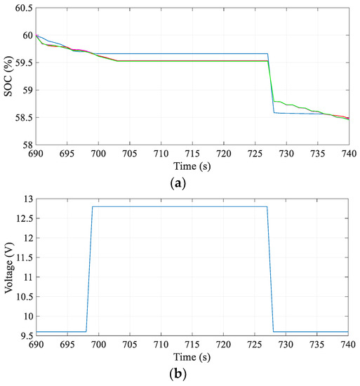 Figure 15a shows the SOCs of the 4 battery cells with the proposed SBP and at around 700 s the communication is lost. At this point, the SOCs remain constant in Figure 15a because the master does not get the SOC updates from the slaves so the SOCs of the cells are unknown to the main controller. As soon as the communication is re-established, the master receives the estimated SOCs from the slaves and then a step is visible in Figure 15a (this is only due to the fact that the master does not know the SOC when the communication is lost, so the real SOC does not obviously present any jumps). At the same time, the output battery pack voltage is measured and shown on the same time scale of the SOC in Figure 15b.