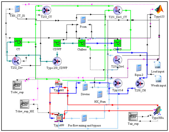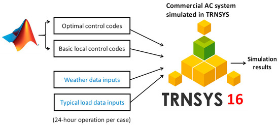 A case commercial AC system is simulated in the Transient System Simulation Tool (TRNSYS) with validated component models. The optimal control codes and basic local control codes are programmed in MATLAB. Actual weather and cooling load data are used as the simulation inputs. The actual system operation is simulated through co-simulation between TRNSYS and MATLAB (Figure 2). Typical weather and load profiles are tested with each case in 24 h. The typical load profiles are identified using a PPA-based K-means clustering approach (see Appendix D). At last, the simulation results are compared to evaluate the performance.