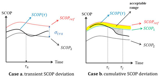 Note that in Event 2, to exclude the model uncertainty in the calculation of the cumulative SCOP deviation, is used instead of in the integration. The curves and , as shown in Figure 3b, define a range in which the SCOP is acceptable. The calculation of the cumulative deviation should start only when the SCOP goes into the range . The calculation will stop, and the cumulative deviation value will be reset to zero when Event 2 or Event 1 occurs.