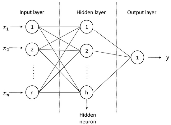 To develop the prediction model of SCOPidl, the ANN algorithm is used since ANN has demonstrated its capability in handling complex relationships in building energy fields [29,30]. A typical three-layer feed-forward ANN (including the input layer, the hidden layer and the output layer) is used in this study (see Figure 4). The identified important variables are used as the ANN model inputs, while the SCOPidl is the ANN output. The ANN toolbox in MATLAB is used, and the Levenberg–Marquardt algorithm (see “trainlm” of MATLAB) is adopted in the training. A different number of hidden neurons are tested to select a suitable number, where the mean squared error (MSE) is used for the model evaluation.