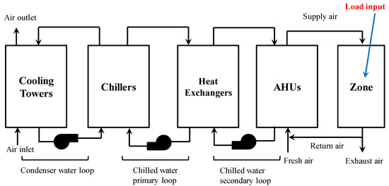 The schematic diagram is shown in Figure 5, which is a typical primary-constant and secondary-variable chilled water system. The specifications of its main components are presented in Table 1. Four critical temperatures are controlled by PI controllers, namely the supply cooling water temperature (), the supply chilled water temperature at the primary () and secondary loops (), and the supply air temperature (). is controlled through varying the cooling tower fan frequency; is controlled by modulating the refrigerant flow rate; is controlled by modulating the water flow rate; is controlled by AHUs. The set-points of the above four critical temperatures are optimized and reset in real-time to achieve the best energy efficiency.