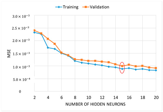 Number of ANN hidden neurons vs. mean squared error (MSE).