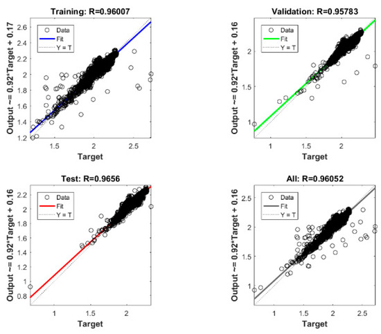 In the ANN model, 70% of the data set was used for training, 15% of the data set was used for validation and the additional 15% of the data set was used to test whether the model can perform well. Since the optimal number of the hidden layer neurons depends upon the specific problem, this study tested a different number of hidden neurons (from 2 to 20). The MSEs of different numbers of hidden neurons were plotted in Figure 8. Figure 8. shows that when the number of neurons increased, the MSE decreased. However, the reduction in MSE became insignificant as the number of neurons was greater than 15. Thus, “15” was selected as the optimal number of hidden neurons. The R-value of the ANN model with 15 hidden neurons was 0.96052 (see Figure 9), with R values of training, validation and test are 0.96007, 0,95783 and 0.9656 respectively, which showed a good prediction accuracy.