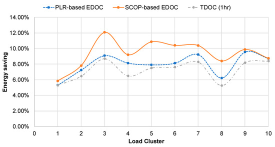 The optimal control performance is evaluated by the energy saving percentage. The energy saving percentage is computed based on the base case (i.e., constant control settings without optimal control). The energy saving percentages of EDOC range from 5.83% to 12.06% for ten different load clusters. In general, as can be seen from Figure 11, SCOP-based EDOC outperforms PLR-based EDOC, and EDOC outperforms TDOC (1 h per optimal control).