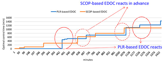 In Figure 12, the optimal control time of EDOC is plotted. The Y axis refers to the time of the optimal control action, and the Y axis is updated each time when this optimal control is triggered. The X axis is the simulation time step in minutes. From Figure 12 (see dashed circles), SCOP-based EDOC tends to react in advance compared to the PLR-based EDOC. The possible reason is because SCOP is a more comprehensive energy efficiency index than the PLR index. SCOP-based EDOC can capture the operation variation earlier than the PLR-based EDOC, leading to a better energy performance. Moreover, inside the solid circles of Figure 12, the SCOP-based EDOC did not take response, while this PLR-based EDOC triggered optimal control. In such circumstances, the PLR varies, but the SCOP still remains at the ideal level, which is unnecessary to trigger optimal control. The SCOP-based EDOC could avoid such unnecessary actions, while the PLR-based EDOC cannot (which is a demerit).