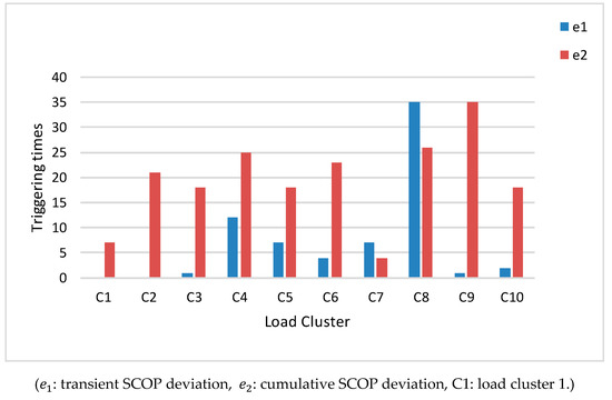 As both transient and cumulative SCOP deviations are used (Section 2.2.2), the event triggering times of the two events are analyzed in this section. From Figure 13, and were triggered differently under different load clusters, sometimes dominates, and sometimes reacts more. For example, in load cluster C1 and C2, only was triggered. In load cluster C3–C10, and both appeared. If only using in load cluster C1 and C2, the SCOP-based EDOC may not work. This validates the idea of combing and to accommodate broader operation conditions, since one event may fail sometimes.
