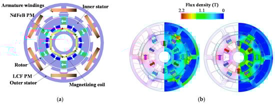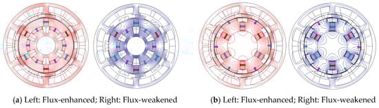 The working principle of the PS-SF-HMMM can be illustrated by using the variable flux characteristics of the LCF PMs [5]. Due to the nonlinear hysteresis characteristics, the LCF PMs can be repetitively magnetized by a magnetizing current pulse fed by the magnetizing windings. In fact, the spoke-type NdFeB PMs are magnetized tangentially and perform the flux-concentrating effect so as to improve the torque capability, whereas the LCF PMs are magnetized radially and behave in the same way as the flux adjustors. When the LCF PMs are bidirectionally magnetized via the magnetizing current, the magnetic fields induced by the NdFeB PM fields are either enhanced or weakened by LCF PM fields. Consequently, as illustrated in the open-circuit field distributions in Figure 1b, the air-gap flux can be flexibly adjusted. Actually, the transient torque and voltage ripples will be inevitably induced during the magnetization or demagnetization process. However, some control countermeasure can deal with this ripple issue, which will be reported in the further papers.