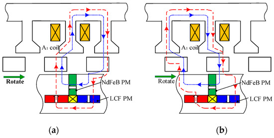 Switched-flux principle of proposed PS-SF-HMMM. (a) Rotor position A; (b) Rotor position B.