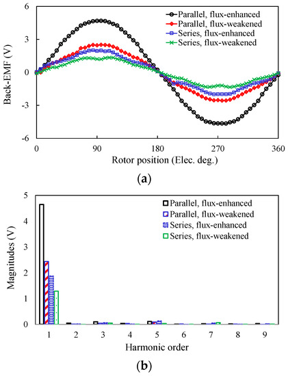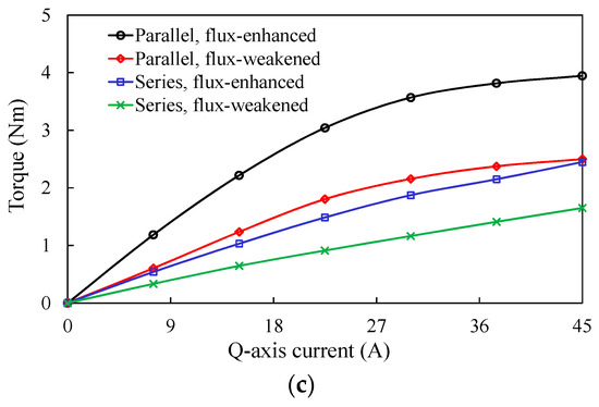 The back-EMF and torque-current characteristics of the two PS-SF-HMMMs under different magnetization states are compared as shown in Figure 4 based on the same peripheral parameters. It shows that the torque capability and flux regulation range of the parallel type significantly exceed those of the series type. This is mainly due to the large magnetic reluctance for the flux loop of the NdFeB PM that acts as the main contributor of air-gap flux in the “series” case. Therefore, the feasibility of the parallel magnetic circuit design is identified, and hence selected for the following investigation.
