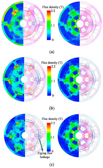 In this section, the geometric parameters of the 6-stator-slot PS-SF-HMMMs featuring “Nr = kNs ± 1” (k = 1, 2, 3) are globally optimized. The cross-sections and corresponding field distributions characterized by “Nr = kNs − 1” (k = 1, 2, 3) are shown Figure 5. It is apparent that the flux adjusting capabilities of machines with “Nr = Ns − 1” are the lowest owing to the localized magnetic saturation in the inner stator.