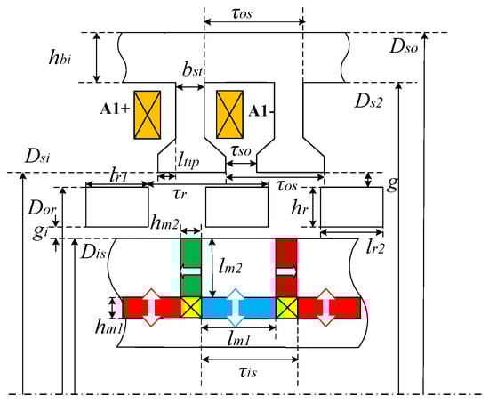 where the split ratio λs can be defined as the ratio of Dsi to Dso; the slot-opening ratio λso is defined as the ratio of τso to τos; the outer/inner rotor pole ratios λro and λri are defined as the ratios of lr1/lr2 to τr. The globally optimized parameters of all the 6-stator-slot PS-SF-HMMMs with “Zr = kNs ± 1” (k = 1, 2, 3) are tabulated in Table 2.