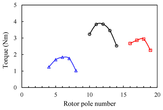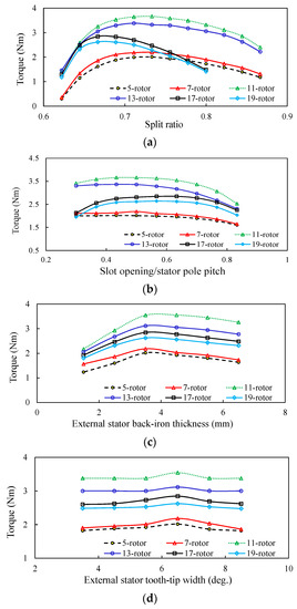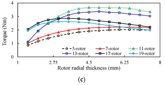 The rotor radial thickness is optimized as shown in Figure 8c. The torque rises first radically within a certain range, and then drops gradually, which is due to the significant flux leakage within the rotor and inner stator parts when the rotor thickness exceeds the optimum values. Moreover, it can be visualized that the higher the rotor iron segment number, the lower the optimum rotor radial thickness, since a thicker rotor pole causes more flux leakage between two adjacent rotor iron segments for the high rotor number cases.