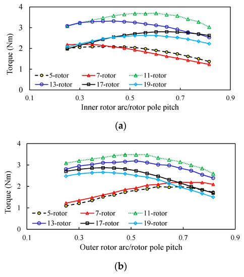 The influences of the inner or outer rotor pole ratios on the average torque are illustrated in Figure 8a,b respectively. The results indicate that the excessive rotor arches leads to the flux leakage, and consequently the torque capability is compromised. However, the effective flux linkage will descend as the rotor pole ratio drops to become lower than the optimum value.
