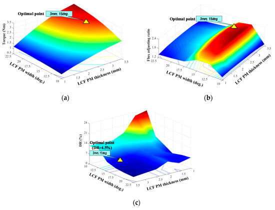 The dual magnet dimensions are further refined with the restriction of the other optimized parameters, as previously mentioned. The variations of torque and flux adjusting ratio with the magnet thickness and length are shown in Figure 9. It is worth mentioning that the flux adjusting ratio is defined as the ratio of phase flux linkages under the flux-enhanced and weakened states. It is obvious that the torque capability is more sensitive to magnet thickness rather than the magnet width, while the flux adjusting ratio rarely fluctuates with the variation of magnet thickness, which matches well with the preceding analyses. In addition, the flux adjusting ratio increases at first, and then drops drastically with the increase of LCF magnet width, which is attributed to the demagnetization occurring in the low LCF PM with lower widths. Whereas, the over-wide LCF PM width will lead to the magnetic saturation in the inner stator iron, and hence limiting the flux adjusting ability. Besides, the on-load demagnetization withstand capability of LCF PMs should be examined to get rid of the unexpected performance degradation. The unintentional demagnetization ratio (DR) due to the load effect can be defined as [22]