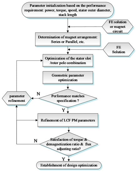 where ψ1 and ψ2 are the phase flux linkages of the machine before and after q-axis current excitation (40A). Figure 9c shows the variation of DR with the PM dimensions. It can be seen that the LCF thickness and width (3 mm/15 degree) can achieve the satisfactory trade-off. As a result, the flowchart of the overall design procedure is shown in Figure 10, which mainly includes the parameter initialization, the magnet arrangement design, parameter optimization and LCF PM sizing refinement, etc. If the predicted performances and specifications do not match very well, the fixed value of the parameters at the start of this design should be refined until they match well with each other. This process may take several iterative loops to get satisfactory results. FEM was employed to check the analysis results of the preliminary design stage.