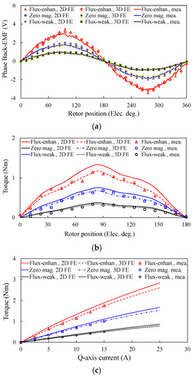 An optimized 6-stator slot/11-rotor pole prototype is fabricated for experimental validations to verify the preceding analyses. The prototypes and test platform are shown in Figure 12. The open-circuit phase back-EMFs for the 6-stator slot/11-rotor pole machine subject to various MSs have been measured and compared with FE predictions as shown in Figure 13a. Meanwhile, the measured and FE-simulated torques versus rotor position and q-axis current characteristics are demonstrated in Figure 13b,c, respectively. It can be founded that a slight mismatch between 2-D FE predictions and measurements exists, because end-effect and mechanical tolerance are not considered in the 2-D FE simulation [30,31,32]. Hence, the three-dimensional (3-D) FE method is conducted, and the relative errors between FE and measured results are tabulated in Table 3. It can be observed that the error increases with the reduction of magnetization state of LCF PMs, which is mainly attributed to more severe fraction and mechanical tolerances at the flux-weakened state [33,34,35,36]. Overall, good agreement can be obtained between 3D-FE predictions and experimental measurements. Thus, the validity of the theoretical analyses was verified.