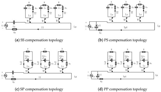 The power transfer part of the charging system can be simplified to a loosely coupled transformer. Due to the relatively large air gap between transmit coil and receive coil, the magnetic flux leakage problem is serious, which reduces the voltage gain, power factor and transmission energy capability of the whole system greatly. To address this matter, the widely utilized method is to subjoin compensate topology to resonate the circuits, increase the power factor and system efficiency []. Assuming power receivers are identical and decoupled with each other and transmitting track has same coupling strength with every receiver, the compensation topologies can be divided into four basic types based on the way the capacitors connected to the circuits (series or parallel with the coil) as shown in Figure 1, while the more complicated compensation topologies like LCC are not within the scope in this paper. They are SS (series–series) compensation topology, SP (series–parallel) compensation topology, PS (parallel–series) compensation topology, PP (parallel–parallel) compensation topology. In the simplified circuit model with compensation topology, U1 stands for the inverted AC input power, Lp and Ls are the self-inductance of the transmitting and receiving coil respectively, RP and Rs represent the cable resistance value of transmitting and receiving side respectively, Cp and Cs are the compensation capacitances of the transmitting and receiving side circuits respectively. M means the mutual inductance between the transmitting coil and the receiving coil, the load of the battery is roughly equivalent to a resistance R here.