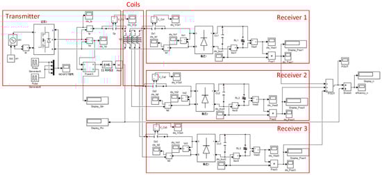 Circuit model of wireless charging system with three receivers in Simulink.
