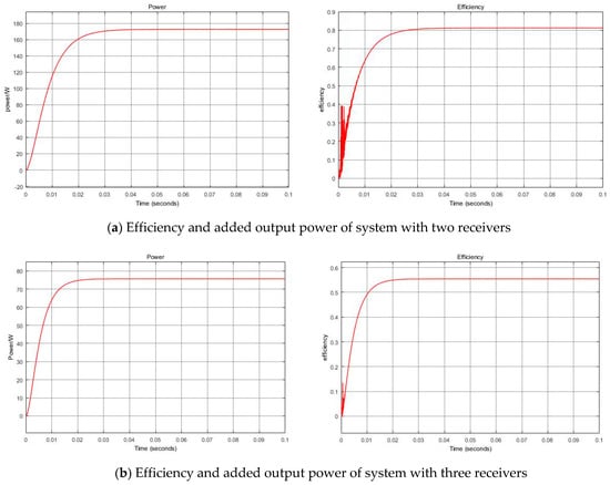 Comparing the added output power curves of the two models, it can be easily found that there is an obvious drop in the power from 172 W to 76 W when the number of receivers increases from two to three. Similarly, a significant decrease of 25.8% in efficiency occurs when the number of receivers exceeds the limitation, with the system efficiency is 81.2% when two receivers and 55.4% when three receivers. The great decrease in both power and efficiency indicates the occurrence of frequency bifurcation when the number of receivers exceeds the limitation presented in Equation (20), which is consistent with the conclusion of theoretical analysis.