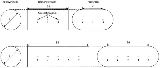 As shown in Figure 5, the racetrack and rectangle tracks with a length 2d and 3d, assuming the diameter of the receiving coil is d, are studied respectively. Moreover, all the tracks are wrapped the same number of turns using the same wire in the same way. During the simulation, there are isometric points with which center of the receiving coil is going to be aligned. During the charging process, the motion speed will also influence the vehicle density and thus the number of receivers coupled with a given length track, which has been carefully analyzed in [] and is not in the scope of this work. Therefore both the transmitting track and receiving coil are static at each simulation point and analyzed from point 1 to point 3 or 5. Taking 2d racetrack for example, there are actually three simulation models since there are three simulation points as shown in Figure 6. Simulation related parameters are listed in Table 2.