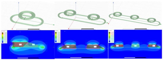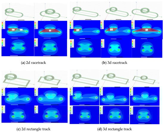 The simulation models built in MAXWELL (18.2, ANSYS, Pittsburgh, PA, USA) and magnetic field distributions on XZ plane and YZ plane of each model are obtained with part of them shown in Figure 6 considering that they are symmetrical about the center. For better illustration the red quadrilateral marks are added to show the strong flux supported by the left/right side of the track, and the green quadrilaterals represent relatively weak flux. The coupling coefficient at different test points of each track are listed in Table 3.