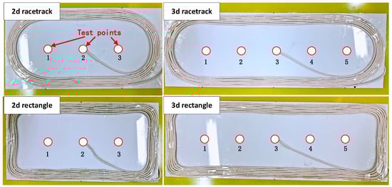 As shown in Figure 9 and Figure 10, circular receiving coil and transmitting tracks of different shapes and lengths, exactly same with simulation parameters set in Table 2, with transmitting tracks wrapped 6 turns and receiving coil wrapped 10 turns with litz wire of 3 mm diameter to testify the feasibility and accuracy of the simulation and optimization algorithm. Same with simulation method, the output power and efficiency are tested with both transmitting track and receiving coil static from point to point. Besides, as presented in Table 5, the system is powered by a 10 V power supply, the track and receiving coil are separated by a 50 mm thick foam box, the system adopts SS topology with 100 kHz operating frequency and the load of the system is an adjustable resistor which is fixed at 10 Ω during the test.