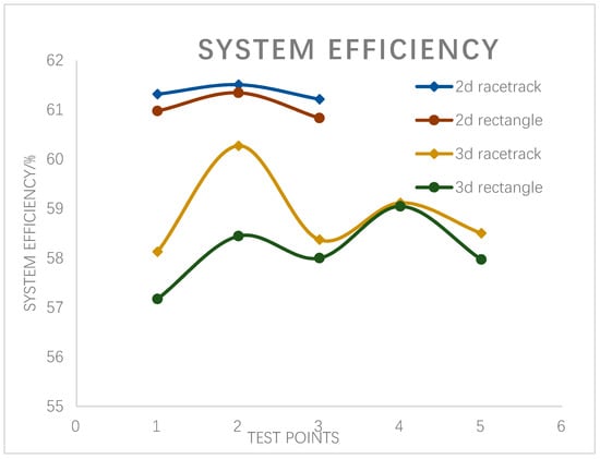 Looking at the system efficiency of 2d racetrack and 2d rectangle respectively, it can be observed that, for both, the efficiency is higher in the middle of the track than at the two sides. Moreover, the efficiency of the racetrack is higher than that of the rectangle track, which is consistent with the trend of coupling coefficient k in simulation results. By further analyzing the testing data of the 3d racetrack and 3d rectangle, it can be revealed that, for both tracks, the transmission efficiency first increases and then decreases when the receiving coil moves from the side to the middle of the track. Similarly, the efficiency of the 3d racetrack is better than that of the 3d rectangle track. To sum up, the racetrack has slightly better performance in terms of efficiency than rectangle track.