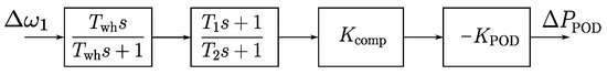 In the POD block diagram shown in Figure 4, is the time constant of the washout filter. The filter with and is used for phase regulation (to make the input and output of the POD controller in exact opposite phase) and compensates a gain reduction that is caused by the filters. is the POD gain which is determined based on the desired damping coefficient, and also regarding the amount of power deviation, , which can be tolerated by the OWF.