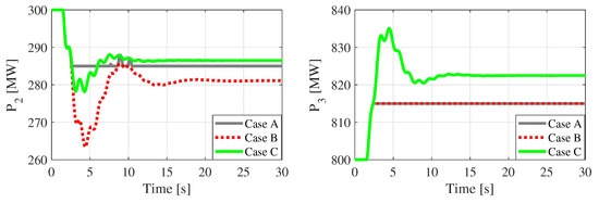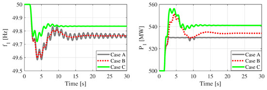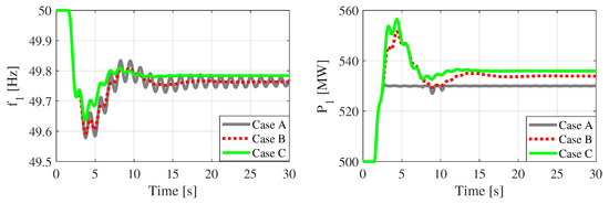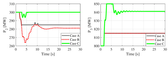 Simulations of the system considered in Section 2 are presented in this section. Simulations have been implemented in MATLAB/Simulink to analyze the results in both time and frequency domain. It is assumed that the OWF generates 800 MW power and has 50 MW extra capacity for the primary reserve. 500 MW of OWF’s power flows to onshore System 1, and 300 MW to System 2 under steady state condition. Modular multilevel converters (MMCs) are used for the HVDC converters. The MMC model used simulations is an average model of half-bridge type converter with 200 submodules per arm. Power/voltage and inner-current controllers of the converters are modeled with full details. Each onshore grid is modeled as an aggregated synchronous machine equipped with prime mover, governor, and AVR. Moreover, passive loads are connected to the generators via transformer and AC lines. The model used for synchronous generators has field and damper windings on its d-axis and two damper winding on its q-axis. The prime movers of the generators are of hydro-turbine governing system.