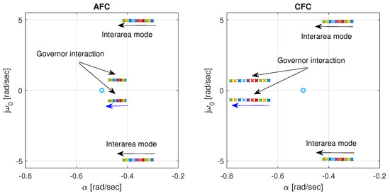 The simulation results, showing , , and , are presented in Figure 5 and Figure 6 when using AFC from the offshore HVDC. From plot, it is shown that the damping of the interarea oscillations is improved if the oscillations can be observed by the OWF and/or VSC2. In the Case C where the power is limited in both OWF and VSC2, the onshore oscillations are not observed and no damping is provided by the frequency control, although the steady state of frequency has been improved by 15 MW extra power from the OWF. To realize more about the impact of primary frequency control of offshore HVDC on interarea oscillations damping, the eigenvalues of the system are plotted in Figure 7. The gain of the frequency control, , is increased from 12.5 to 17.5 per-unit, which results in increasing the damping coefficient of interarea mode, i.e., shifts more to left hand side on the s-plane. Plotting the eigenvalues in Figure 7, it is assumed that there is no power limitation on the OWF and HVDC converters.