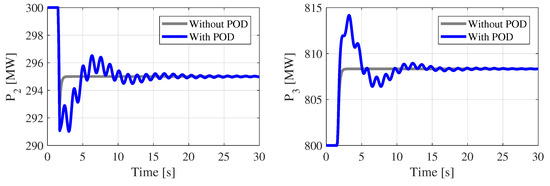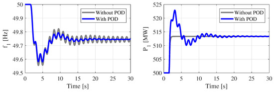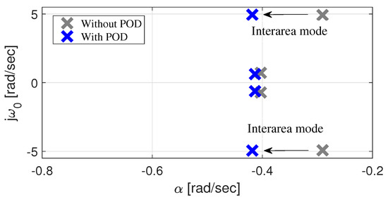 Simulating the POD functionality, it is supposed the primary reserve of the OWF is limited and VSC2 has also a limited power change, similar to those of Case C. The POD simulation results are shown in Figure 10 and Figure 11. It is shown that using the POD control, the onshore oscillations are observed by the OWF and VSC2 which contribute in onshore POD control. It is obvious in Figure 11 that very slight variation in and can result in significant damping of onshore system oscillations which is shown in plot in Figure 10. The damping improvement by the POD control can be better shown by the complex-conjugate eigenvalues related to interarea modes that are presented in Figure 12.