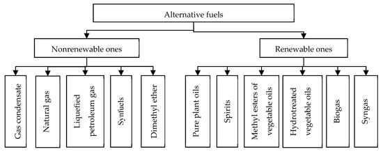 Most land transport vehicles are designed to be operated on petroleum derived fuels (gasoline and diesel fuel). Conventional fuels are fuels derived from petroleum. Alternative fuels are not petroleum fuels and can be produced from fossil energy resources (compressed natural gas, liquefied natural gas, liquefied petroleum gas, etc.) or biomass [33]. In practice, both pure and blended biofuels are used. Compressed natural gas competes with petroleum fuels in the vehicle fuel market and it is expected to be a growing vehicle fuel in the world in the next decade [34]. The classification of fuels was considered in previous investigations [35,36]. Alternative vehicle fuels can be divided into renewable and nonrenewable ones (Figure 1).