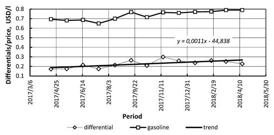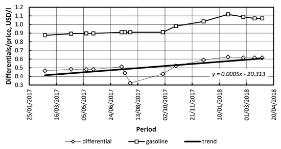 Fuel price differentials depend on the absolute value of conventional fuel prices. The linear correlation coefficient r measures the strength of the linear relationship between two variables: price differentials and conventional fuel prices (Figure 2 and Figure 3). The linear correlation coefficients were calculated by authors: