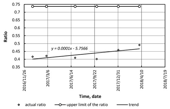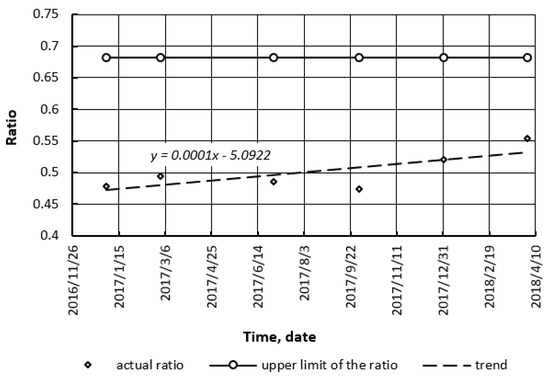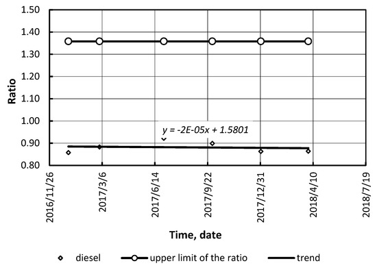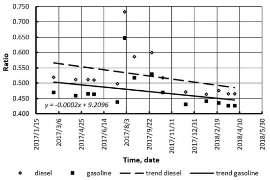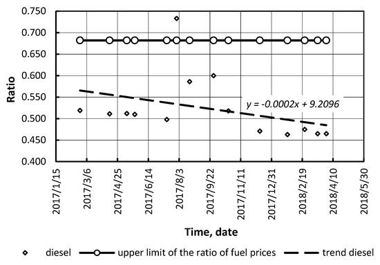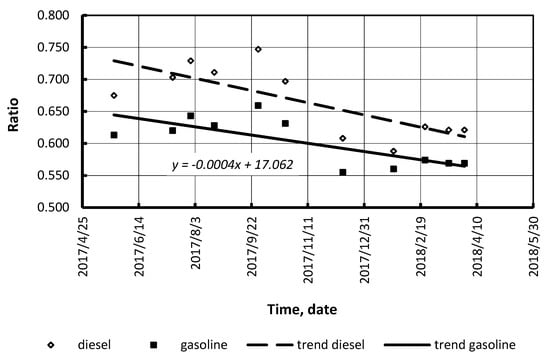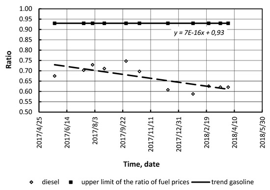 The most widespread fuels were considered: gasoline, conventional diesel fuel, compressed natural gas (CNG) (compressed biomethane), liquefied petroleum gas, biodiesel, and bioethanol blends. Our calculations (for conditions of Ukraine, the USA, and Germany) showed that the ratio of alternative/conventional fuel prices is not stable (Figure 6, Figure 7, Figure 8, Figure 9, Figure 10 and Figure 11). As it can be seen, in Ukraine there was a drop in the ratio. Therefore, alternative fuels (LPG and CNG) may compete with conventional (petroleum) fuels.