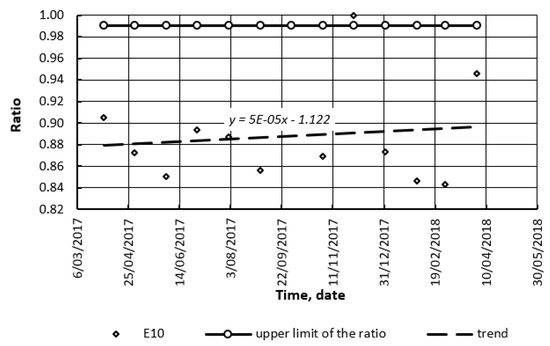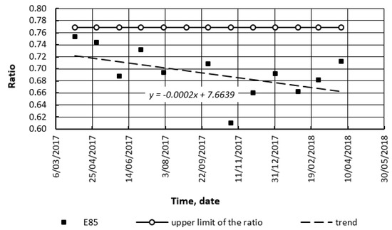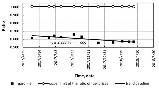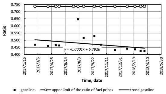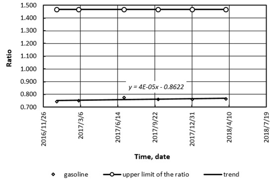 The same method was applied to the fuel markets of different countries: the USA and Germany. The above ratio was determined for bioethanol blends in the USA (Figure 12 and Figure 13), and LPG in Germany (Figure 14 and Figure 17). Figure 12, Figure 13, Figure 14, Figure 15, Figure 16 and Figure 17 present the following: