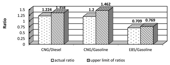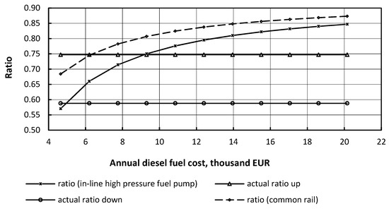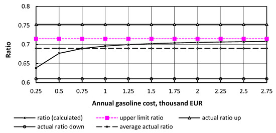 Consumers should have a simple method to evaluate the attractiveness of a certain vehicle fuel. The decision should be made easily based on the absolute value of the prices of different types of fuels. To predict the optimal vehicle fuel simulation models have been developed. The simulation took into account the fuel price differentials (difference between the prices of conventional and of alternative fuels) [19]. The fuel price differentials and the ratio of fuel prices were used in a number of studies [20,21,22]. However, the fuel price differential is an absolute value. This indicator cannot identify the optimal fuel because it depends on absolute prices. The alternative/conventional fuel price ratio is a relative indicator and gives more reliable information about preferable fuel. Abundant research discussions on alternative vehicle fuels have applied an alternative to conventional fuel price ratio: the LPG to gasoline price ratio was used to analyze the LPG market in Poland [23]; the same indicator was used for techno-economic Analysis of Liquid Petroleum Gas Fueled Vehicles for Public Transportation in Indonesia [24]; the compressed natural gas (CNG)/petroleum and LPG/diesel price ratios were used to study the development of natural gas vehicles in China [25] and to study sustainability between CNG vehicle innovative ecosystem and other vehicle innovative ecosystem [26]; the ratio of ethanol and gasoline prices was used as an indicator of ethanol blending economics [27,28,29,30]; the LNG/HFO price ratio was used to study low emission engine technologies for future legislation [31]; and the biodiesel to petroleum diesel fuel price ratio was used to study the efficiency of biodiesel utilization [32]. However, to make an optimal decision, it is necessary to take into account a number of factors: lifetime of the vehicle, fuel prices, fuel properties, investment costs, salvage income, etc. Therefore, consumers need a model that takes the above factors into account.