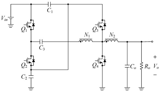 Figure 1 shows the proposed converter, which is built up by four switches Q1, Q2, Q3 and Q4, three energy-transferring capacitors C1, C2 and C3, and one coupling inductor with one primary winding N1, one secondary winding N2 and one magnetic inductor Lm. As for the load, it is constructed by one output resistor Ro. Figure 2 displays an equivalent circuit model of the proposed converter.