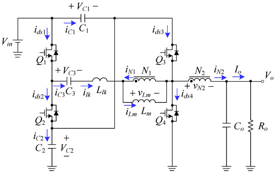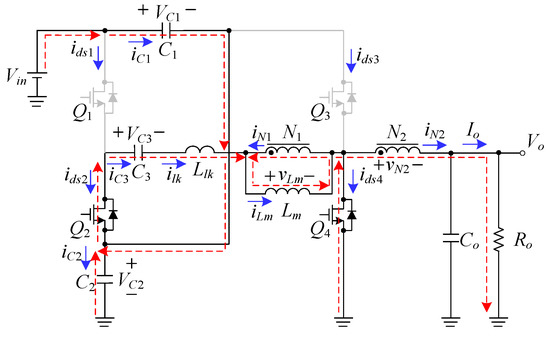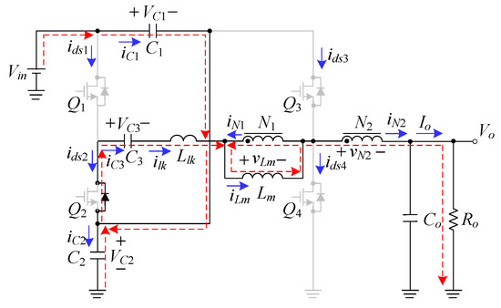 Prior to tackling this section, there are some associated symbols and assumptions in Figure 2, to be described as follows: (i) the input voltage is Vi; (ii) the output voltage is Vo; (iii) the primary-side and second-side turns are N1 and N2, respectively; (iv) the currents ids1, ids2, ids3, ids4, ic1, ic2, ic3, ilk, iLm, iN1, iN2 and io are the currents in Q1, Q2, Q3, Q4, C1, C2, C3, Llk, Lm, N1, N2 and Ro, respectively; (v) the voltages across Lm, N2, C1, C2, C3 and Co are vLm, vN2, VC1, VC2, VC3 and Vo; (vi) the switching period is signified by Ts; (vii) the turn-on times for Q1 and Q3 are DTs, whereas the turn-on times for Q2 and Q4 are (1 - D)Ts, where D is a duty cycle; (viii) all the switches are ideal, and all the capacitors are ideal without their equivalent series resistances (ESRs) included, that is, the capacitance for each capacitor is assumed to be large enough to keep the voltage on it constant at some value; (ix) the gate driving signals vgs1 and vgs3, for Q1 and Q3 respectively, are identical, whereas the gate driving signals vgs2 and vgs4, for Q2 and Q4 respectively, are identical; and (x) the circuit operates with no negative current. There are six states over one switching period, to be shown in Figure 3.