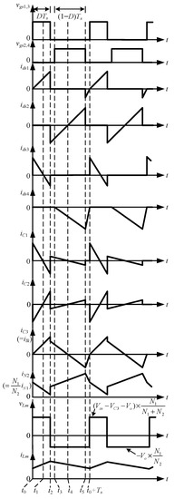 For analysis convenience, it is assumed that there is no power consumption in the converter. According to the voltage-second balance of the inductor and the current second balance of the capacitor, the DC voltage across the coupling inductor and the DC current in the energy-transferring capacitor are zero. Therefore, as shown in Figure 10, the secondary DC current IN2 is equal to the output current Io, namely,