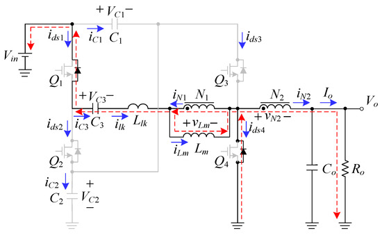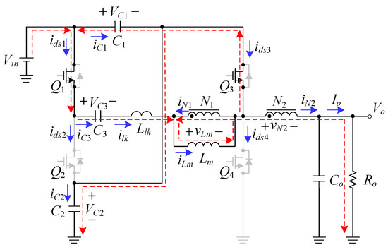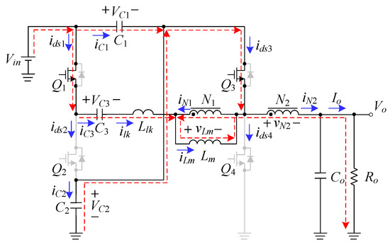 As shown in Figure 4, the switches Q1 and Q3 are in the on-state but the switches Q2 and Q4 are in the off-state. The switch Q1 is turned on with zero-voltage switching (ZVS) because the body diode of Q1 is switched on before turn-on of Q1. During this state, the voltages across the magnetizing inductance Lm and leakage inductance Llk are positive voltages, thereby causing Lm and Llk to be magnetized. At the same time, the voltage Vin charges the capacitors C1 and C3, and, together with the capacitor C2, supplies energy to the load. To speak lucidly, at t = t0, the current in C1 has some positive value and then linearly decreases due to the leakage reflected from the primary-side leakage; at t = t0, the current in C2 has some negative value and then linearly decreases due to the leakage reflected from the primary-side leakage; At t = t0, the current in C3 is zero and then linearly increases due to the primary-side leakage. As soon as iC1 and iC2 reach zero, this mode ends at t = t1.